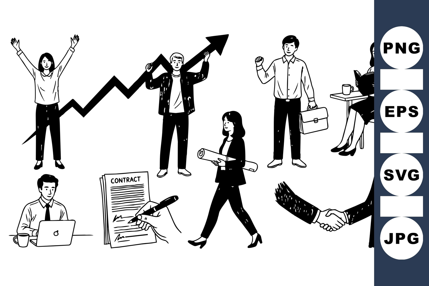 Various business people in black and white line art style with contract signing, handshake, upward arrow graph, laptop and reading scenes showing professional teamwork and success.