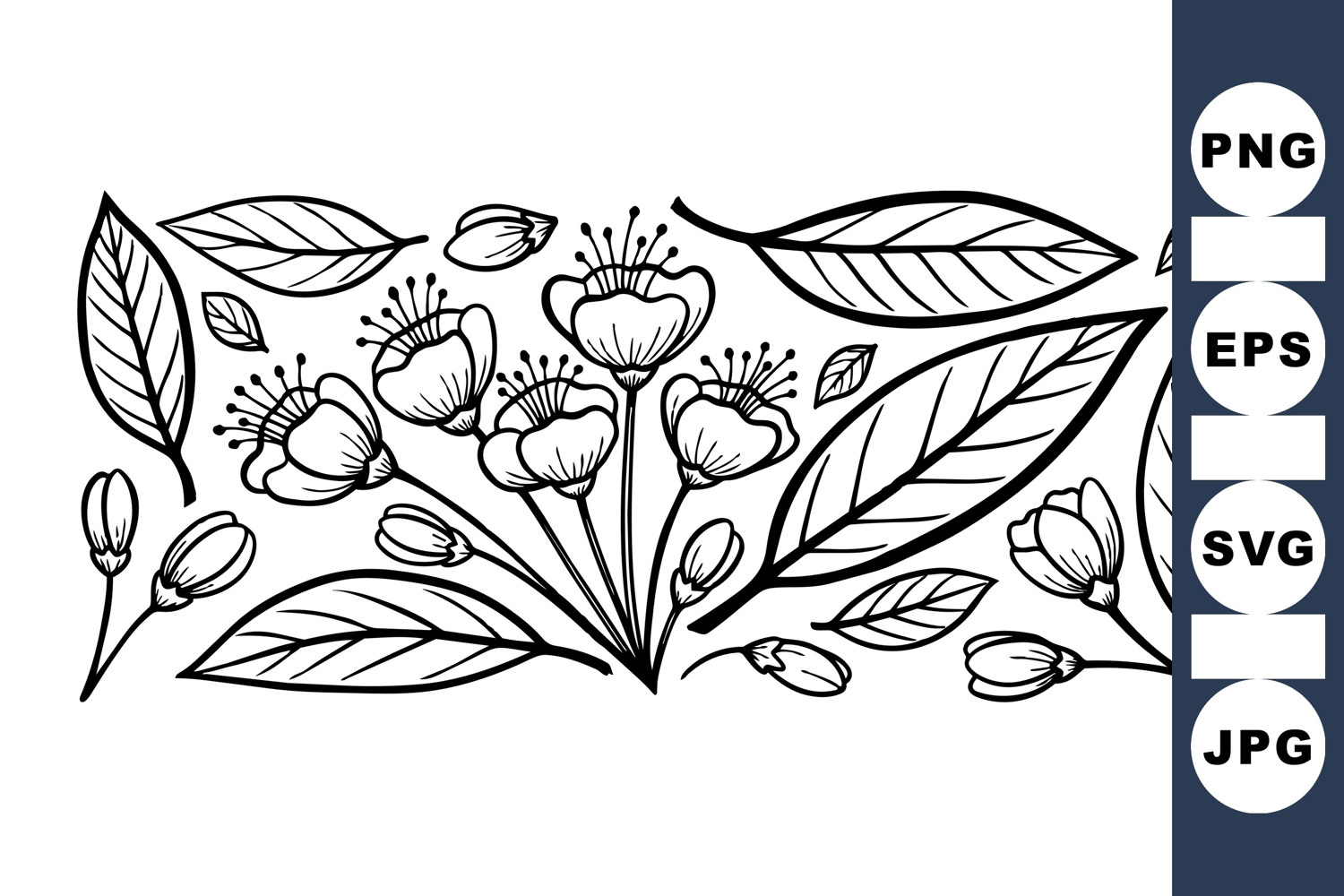Line art showcases blooming cherry blossoms with detailed leaves and buds in a minimalist black and white botanical drawing suitable for coloring or design projects.