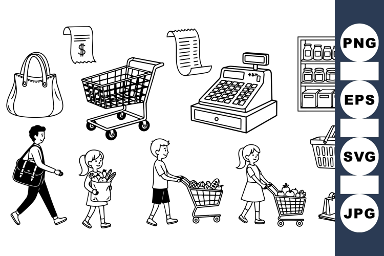 Grocery Shopping Clipart Shopping Bag Design Shopping Cart Vector Cash Register Illustration Market Basket Clipart Family Shopping Graphics Checkout Counter Drawing Paper Receipt Vector Kids Grocery Clipart Store Shelf Illustration