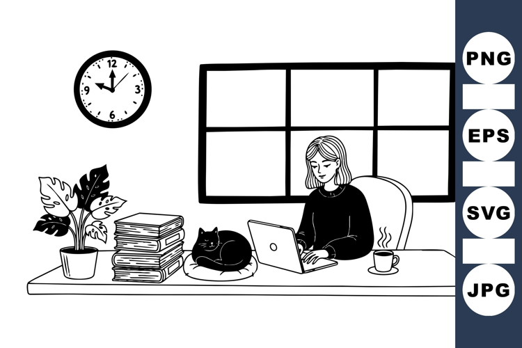 Monochrome vector art showing a woman working on laptop at home office desk with a sleeping cat on cushion, coffee mug, and stack of books in calm ting.