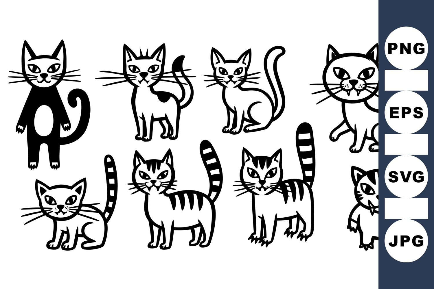 A collection of eight black and white stylized cat illustrations showing various poses facial features and striped tails in vector art style playful and bold.