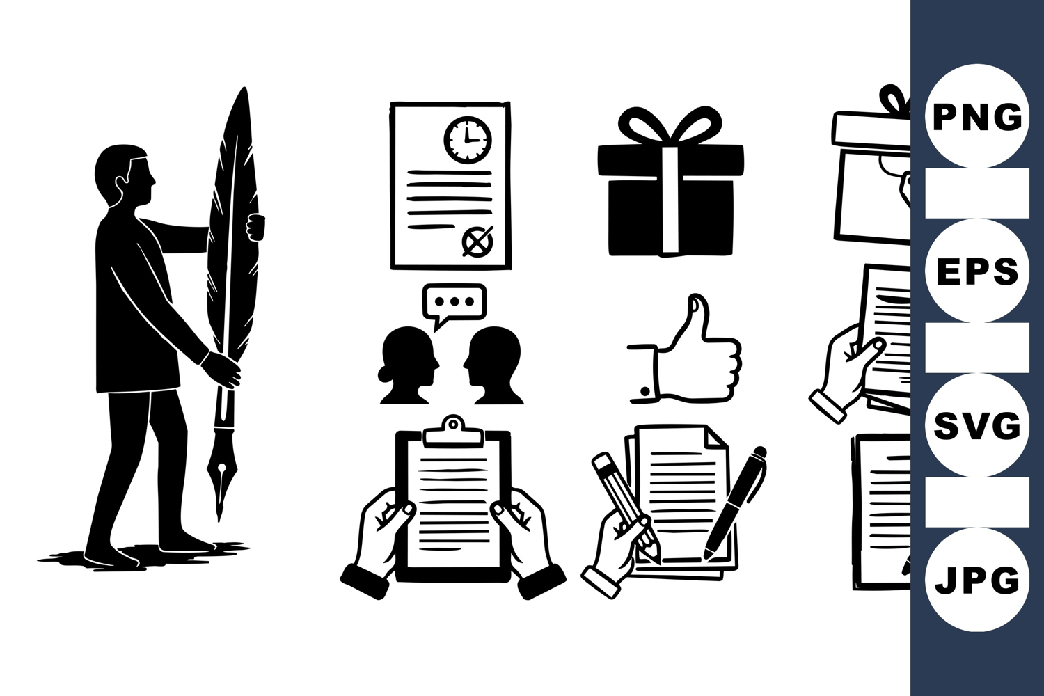 Silhouette style vector shows a man holding a large feather pen alongside hands holding documents, checklist, discussion, gift boxes, and thumbs up icons in minimalist black design, symbolizing communication and approval.