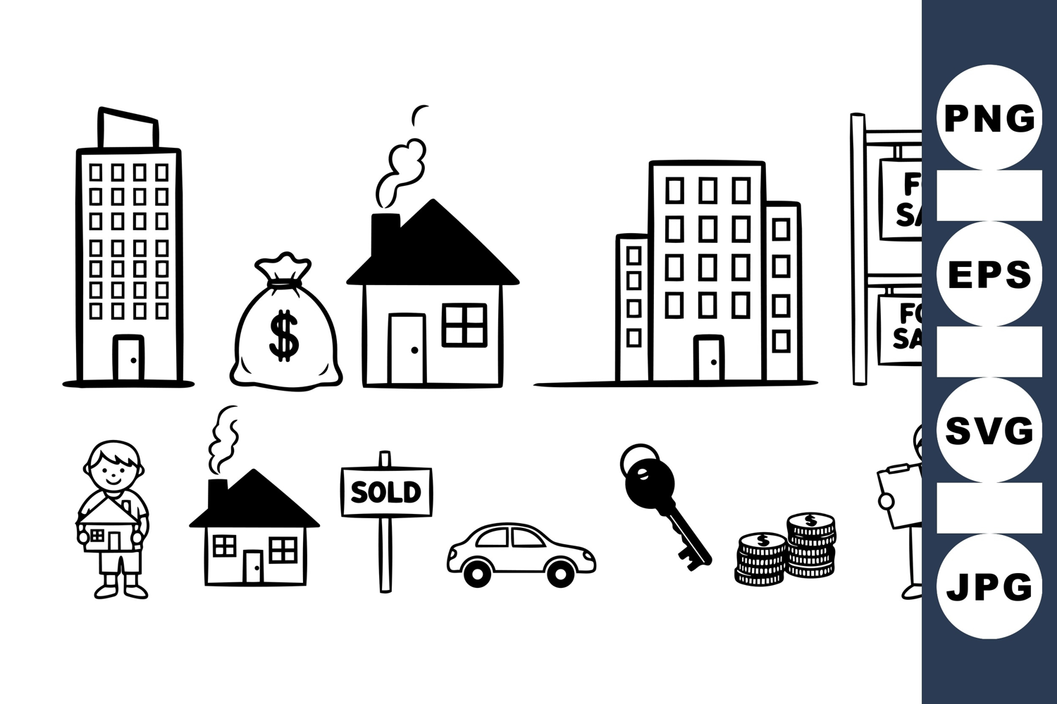 Simple black and white line drawings of real estate elements such as buildings, homes, for sale signs, and an agent holding a clipboard, minimalistic style with clear iconography.