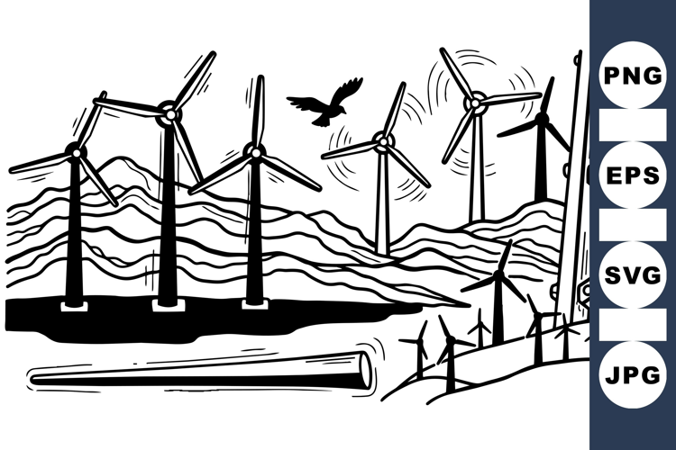 Hand drawn black and white vector art depicts wind turbines spinning on a mountain landscape with a bird flying, illustrating renewable energy concepts in a simple style.