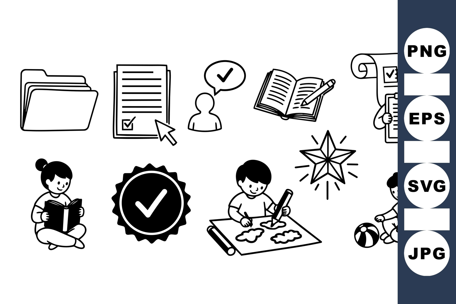 Simple black and white line art vector including folder, checklist, person icon, children reading, writing, drawing, playing, and star with approval badge icons.