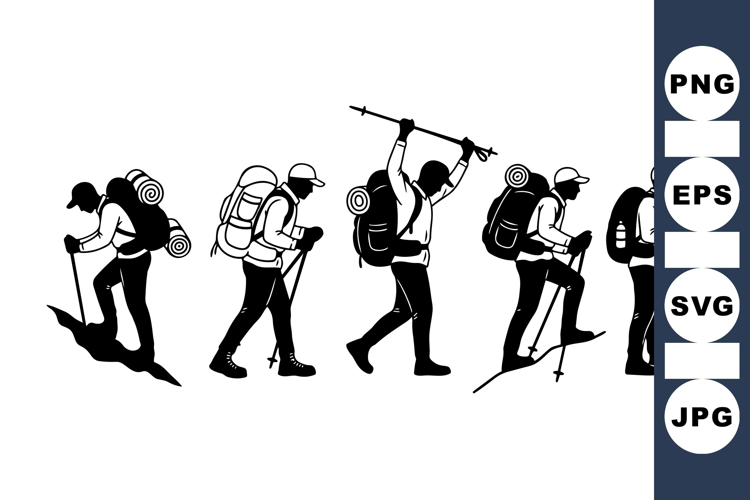Black silhouette vector artwork showing five hikers with backpacks and walking sticks in different walking poses, ideal for outdoor adventure design themes, crisp and bold.