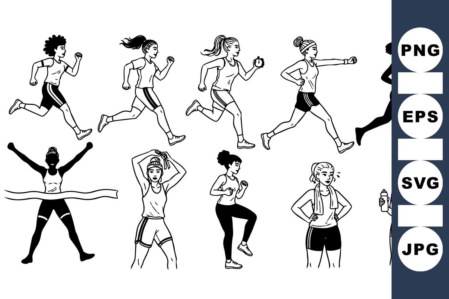 A diverse group of active women depicted in black and white line art style running, stretching, sprinting, and cooling down with water bottles and towels in energetic poses.