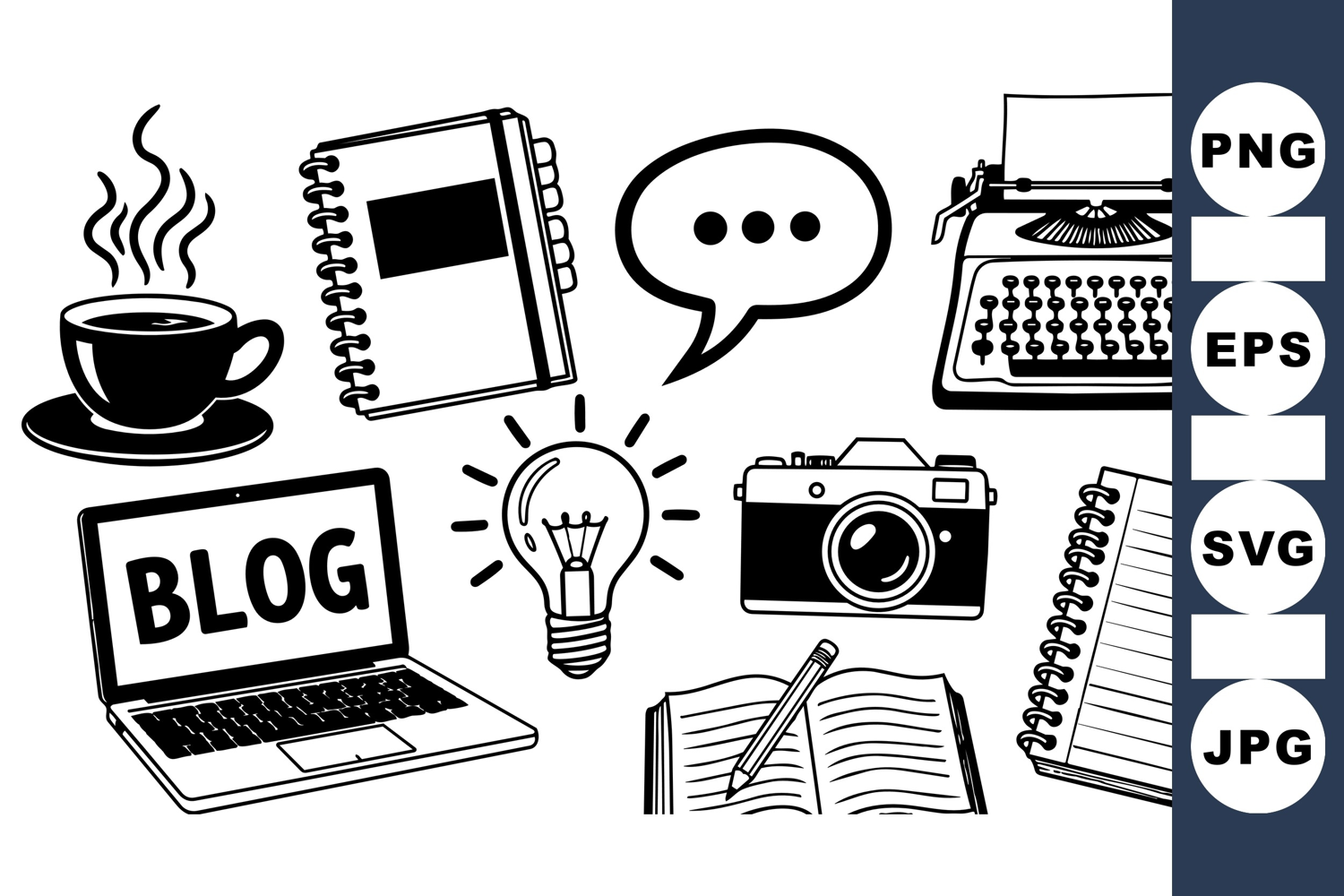 Black and white vector art featuring vintage typewriter, camera, light bulb, coffee cup, laptop with blog text, and various notebooks for creative writing and blogging inspiration.