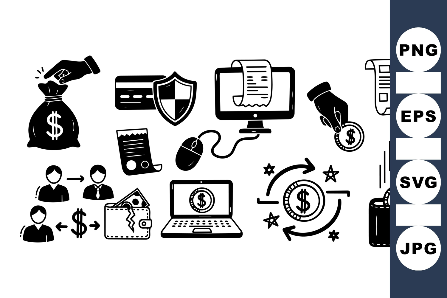 Monochrome vector icons depict hands holding money bag and coin, laptop with dollar sign, mouse, security shield, and wallet with coin storage in financial context.