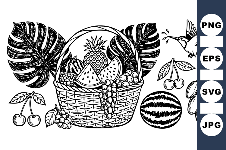 Intricate black and white line art shows a tropical fruit basket surrounded by cherries, grapes, watermelon, and a hummingbird, creating a natural and detailed composition.