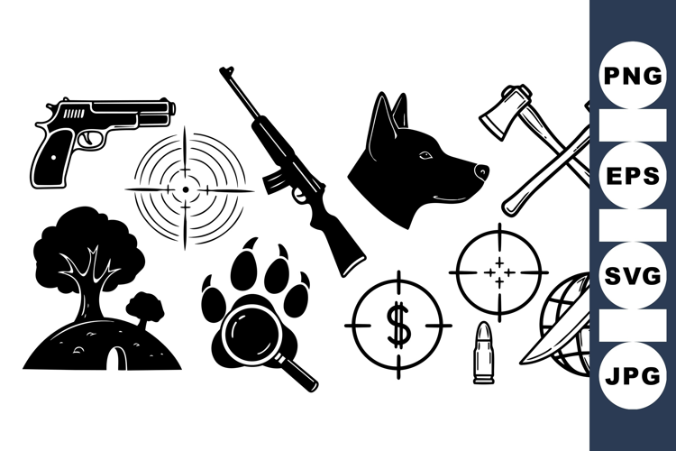 Collection of black silhouette vector icons including hunting rifle, pistol, dog head, crossed axe and shovel, paw with magnifier, knife and globe, bullet, and target symbols.