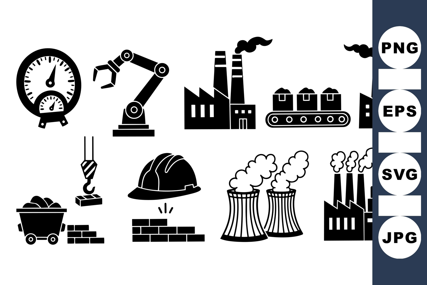Industrial Icon Robotic Arm Design Manufacturing Clipart Pack Factory Vector Construction Helmet Graphic Production Line Illustration Heavy Industry Icons Industrial Plant Graphic Conveyor Clipart Smokestack Vector Art