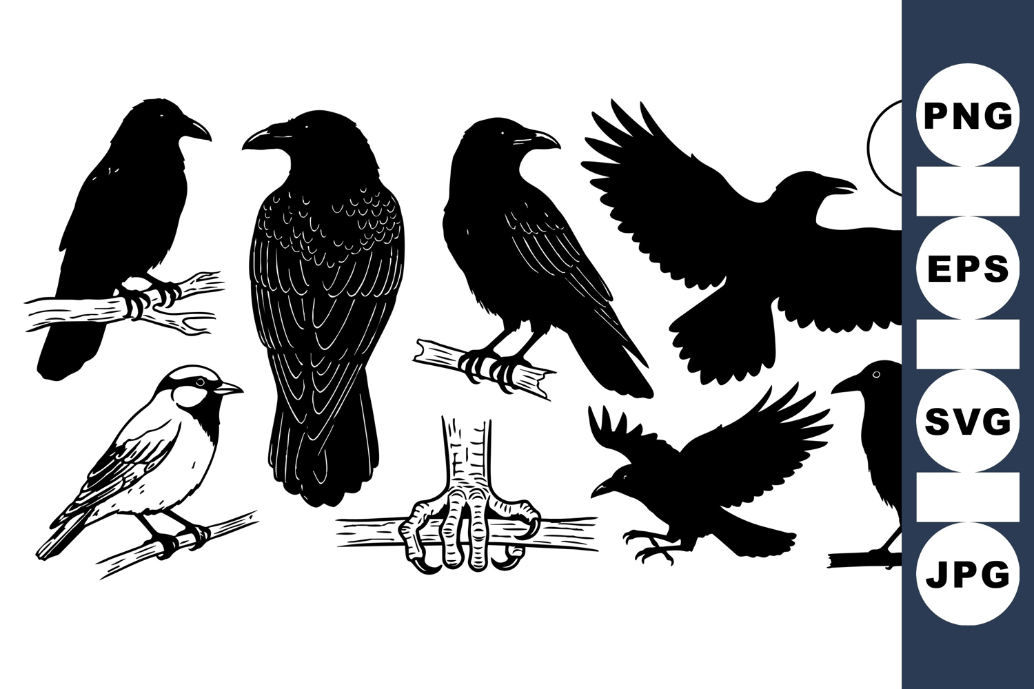 Silhouetted crows in various poses including perched, flying and talon close up shown as black vector art with crisp monochrome contrast and natural posture detail