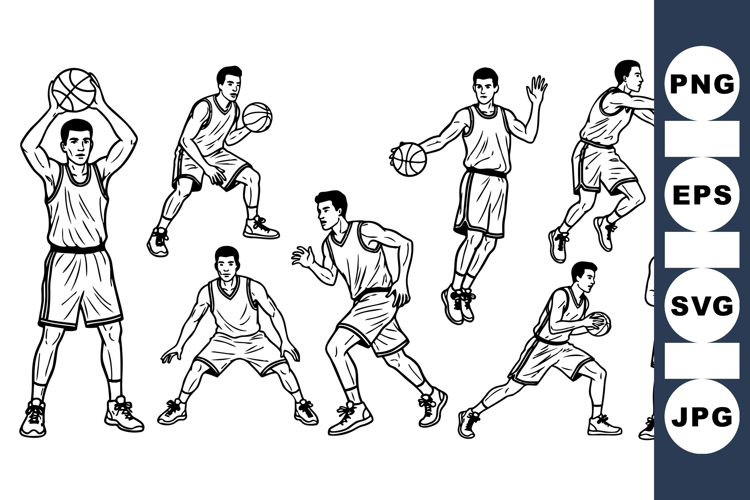 Multiple basketball players depicted in clean line art style showing a range of active motions such as defending, dribbling, shooting, and passing in monochrome.