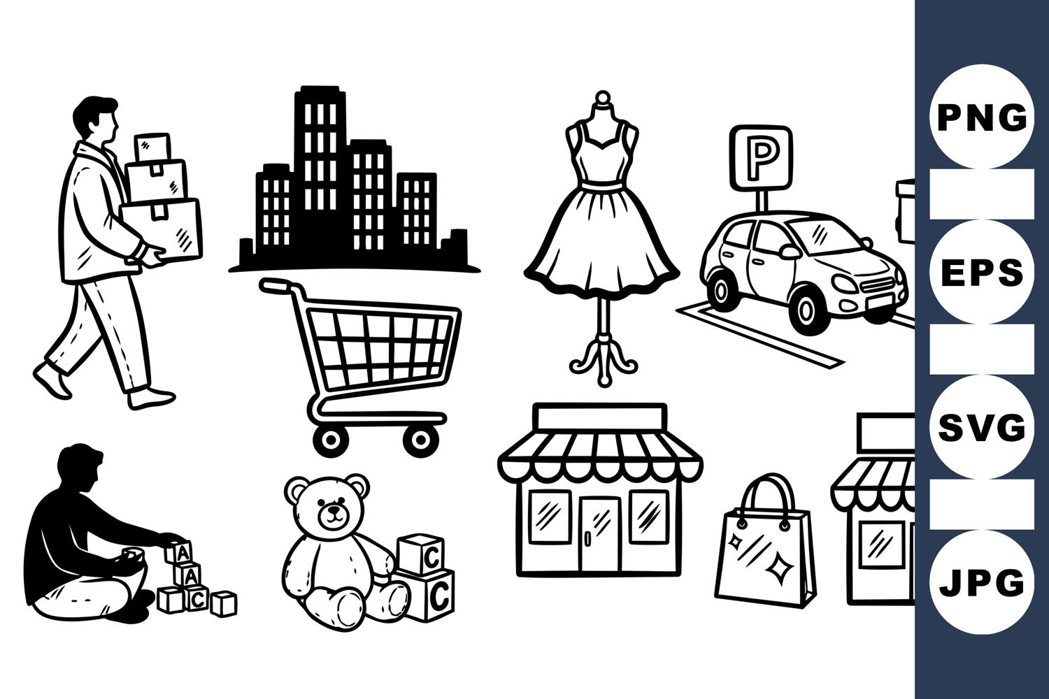 Hand drawn style black and white vector collection features people with packages, shopping elements, toy blocks, and retail storefronts for concept use.