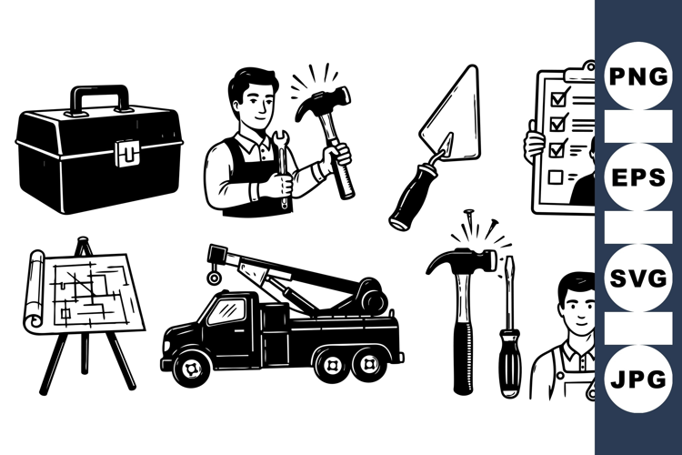 Monochrome vector art displays a construction worker with tools, truck, blueprint, trowel, and checklist in flat black and white style, practical and clear design.