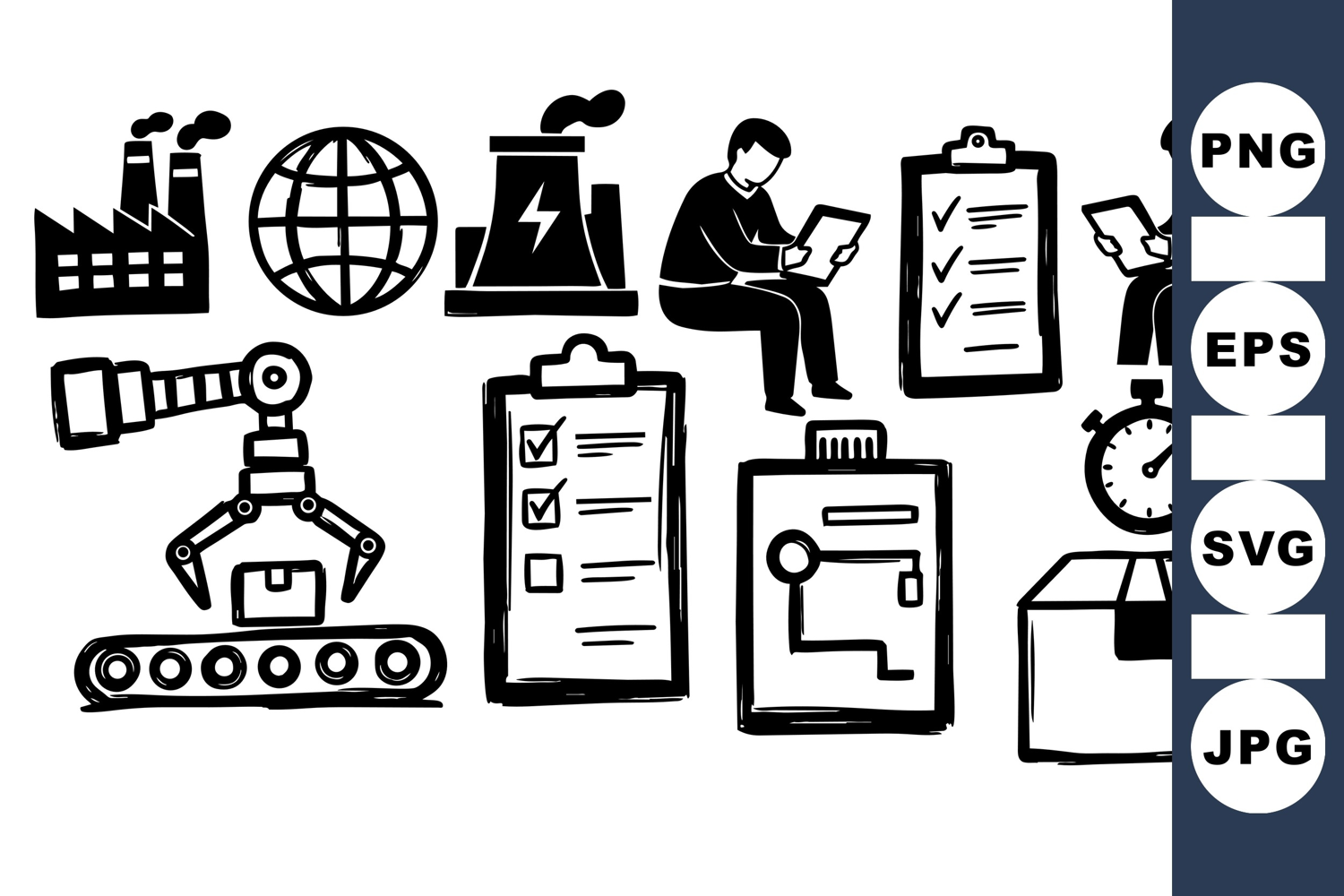 Black and white vector art showing factory buildings, robotic arm handling box, checklists, and stopwatch for industrial and logistics themes, minimalist style.