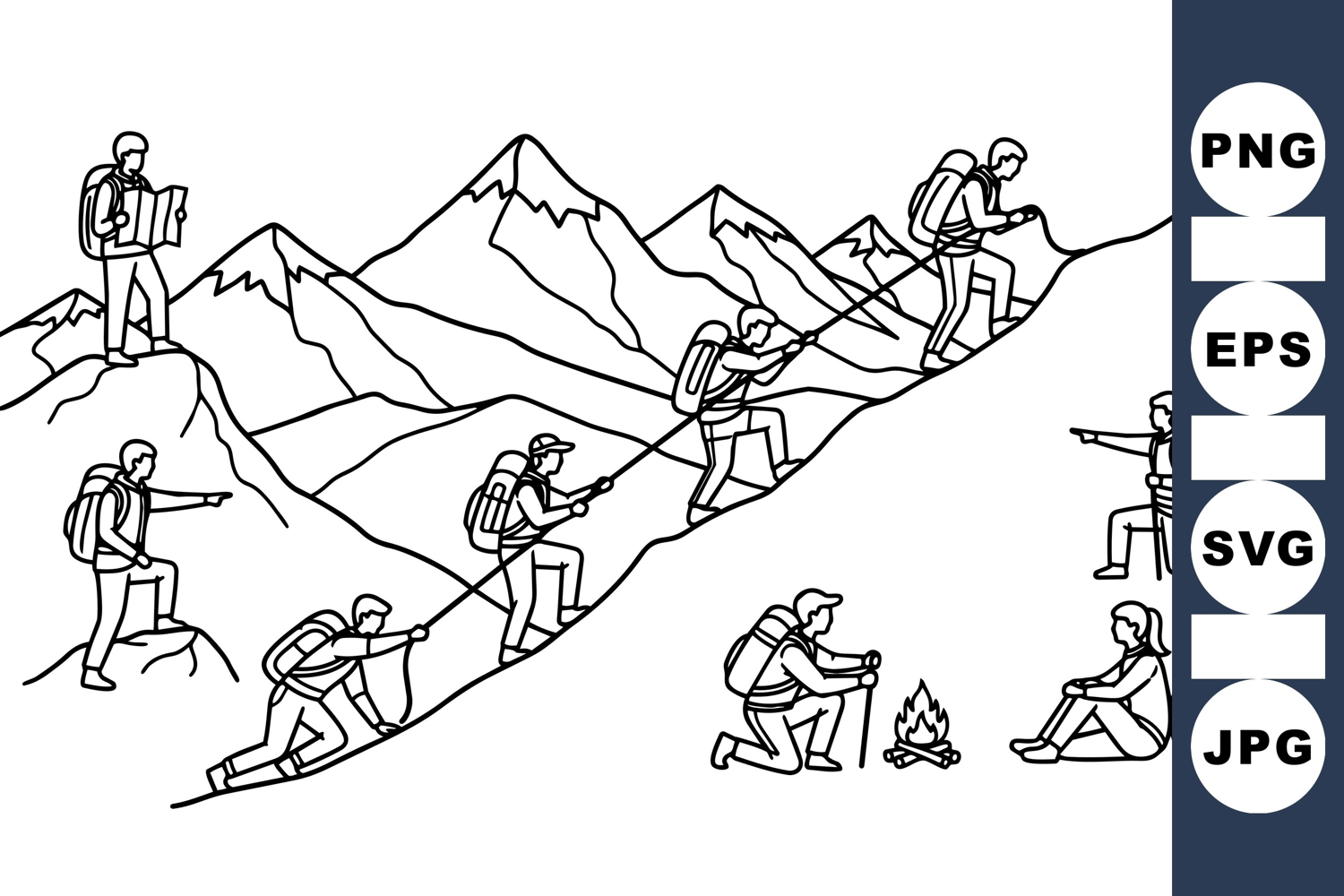 Black and white line art of climbers hiking mountains, using ropes, maps, and camping with a fire, showing teamwork and adventure in rugged landscape.