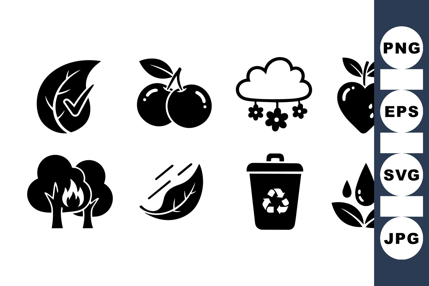 A collection of black silhouette nature themed icons featuring leaves, fruits, fire, recycling bin, and water drops, designed in simple vector style, clean and minimalistic.