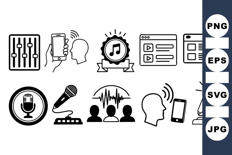 A collection of black and white icons illustrating audio mixer controls, voice recognition with smartphone, microphones for recording and podcasting, presented in a flat vector style.