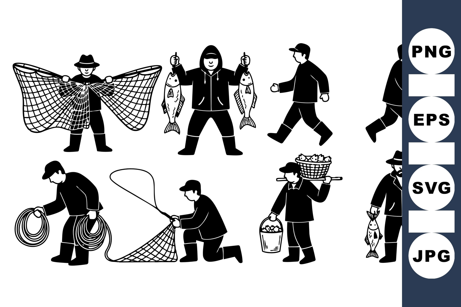 Silhouetted fishermen depicted fishing actions including casting nets, carrying baskets and holding fish, rendered in simple black vector style, showing traditional fishing activities.