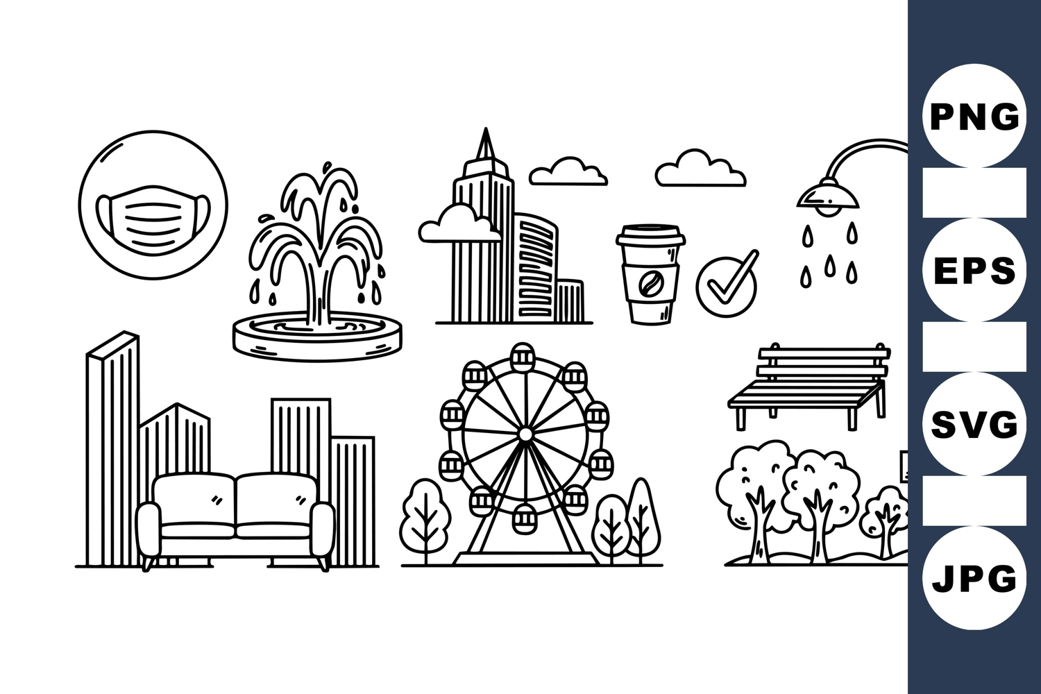 Line Art Ferris Wheel Icon Face Mask Icon Cityscape Illustration Urban City Icon Park And Bench Coffee Cup Lineart Public Space Design Modern Building Sketch Street Lamp Vector