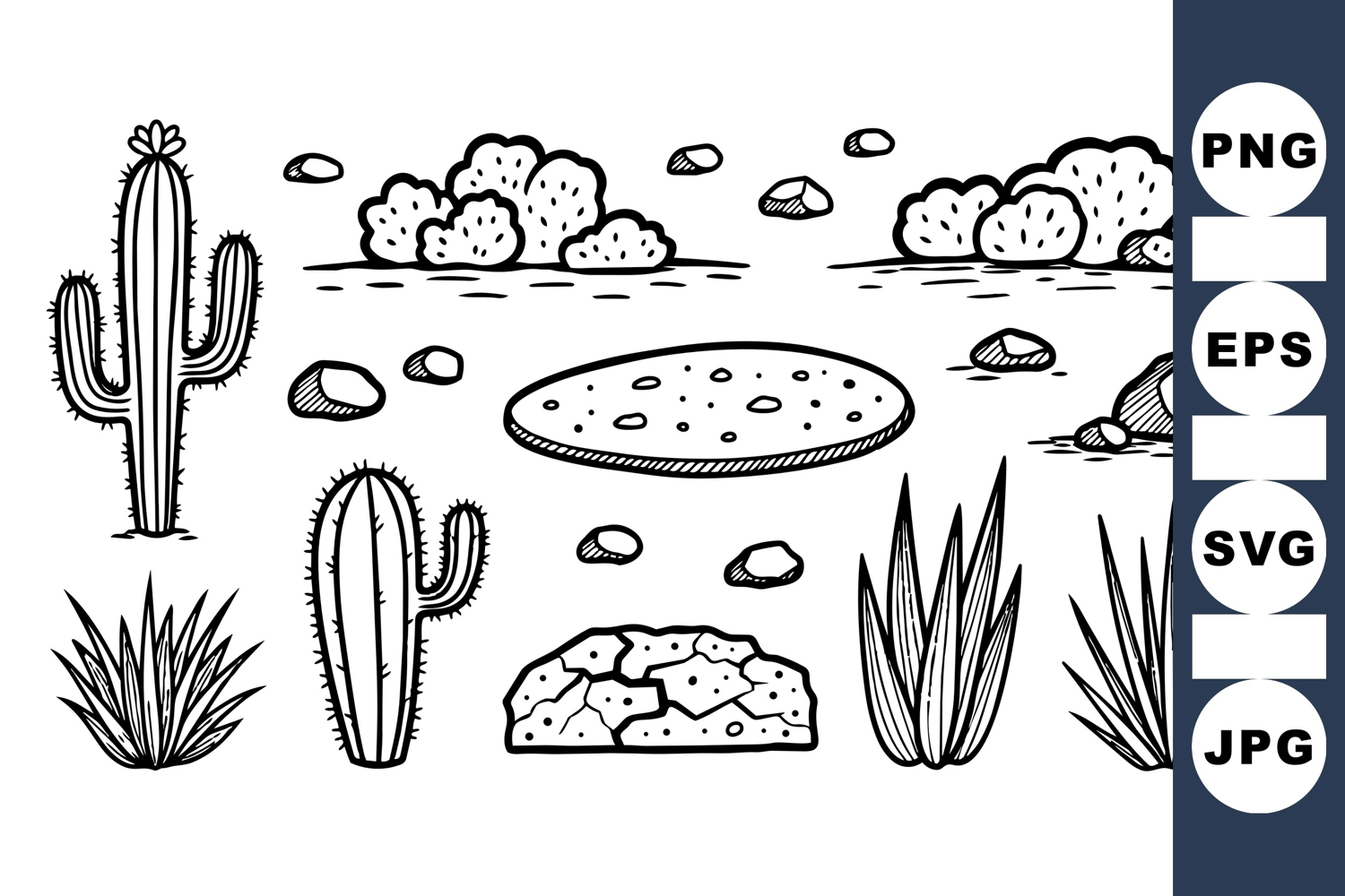 Black ink line art featuring various cacti, desert bushes, rocks, and dry terrain elements in a hand drawn sketch style for natural themed design projects
