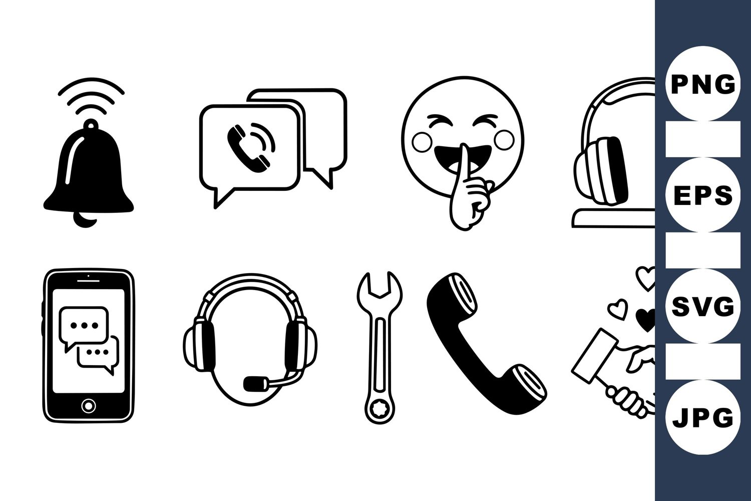 Black and white line art vector icons featuring communication symbols, head, wrench, phone receiver and handshake with hearts, suited for tech or communication designs.