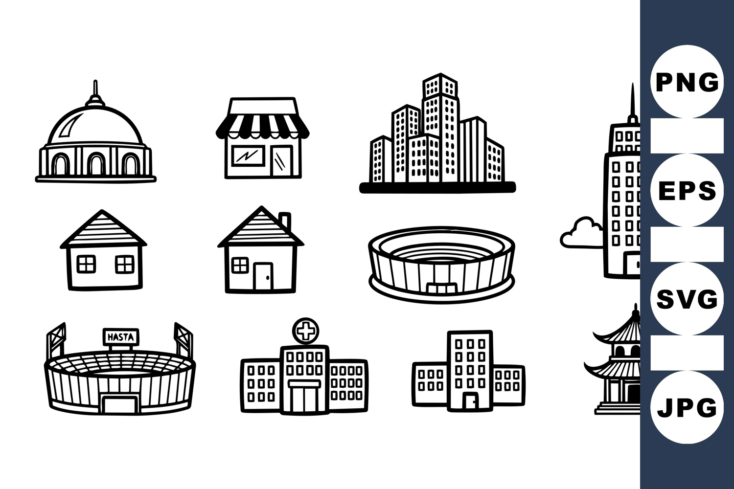 Collection of hand drawn black and white vector icons showing various building types and architectures including houses, shops, stadiums, hospitals and pagoda designs in minimal line art style, suitable for web and print, clean and simple.