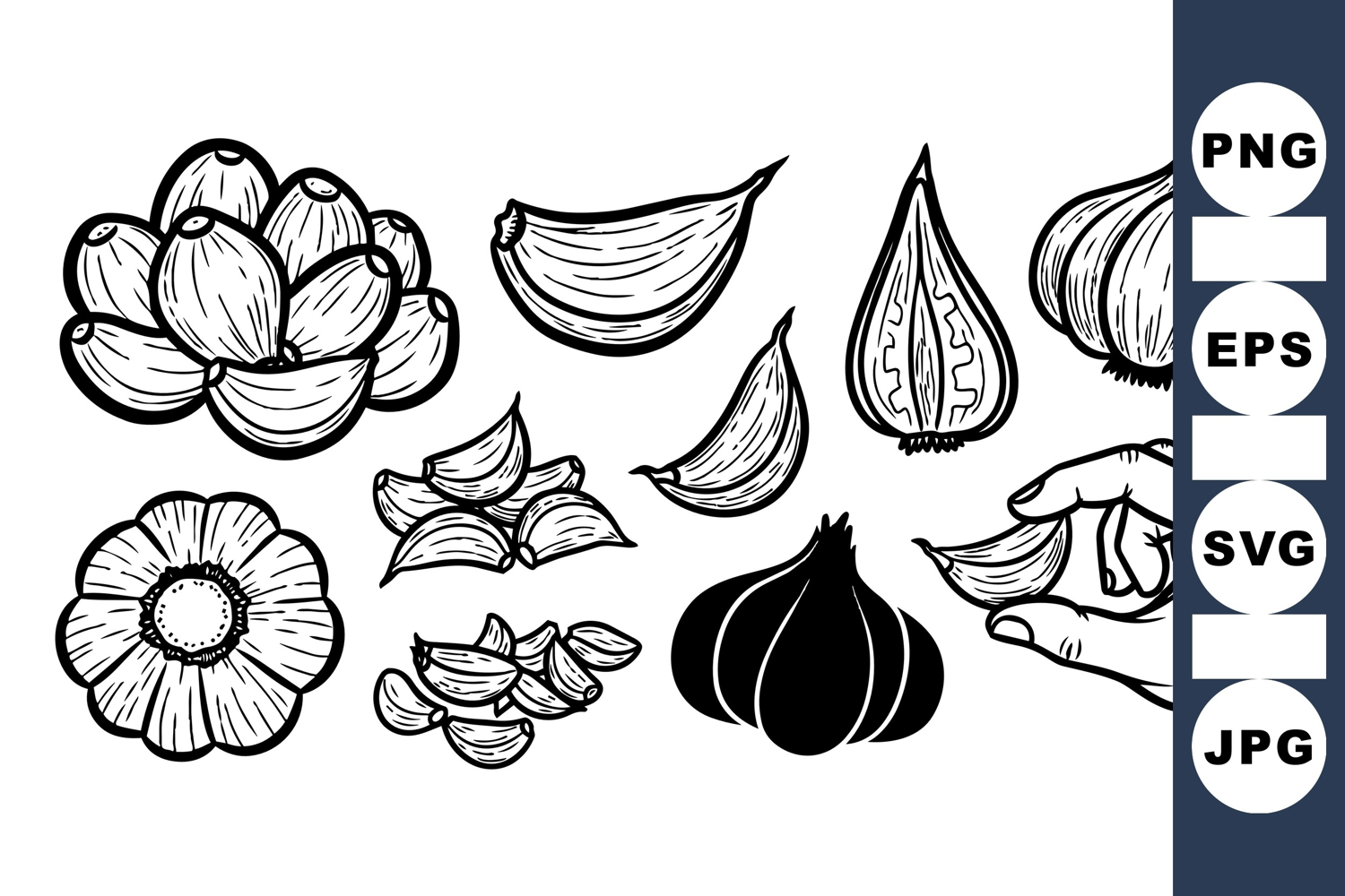 Detailed black and white line art showing garlic bulbs, cloves, cross sections, and a hand holding a clove in botanical style illustration.