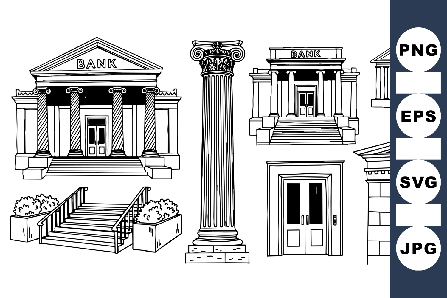 A collection of hand drawn black and white vector drawings depicting classical bank buildings, corinthian columns, doors, stairs, and architectural details with crisp line art.
