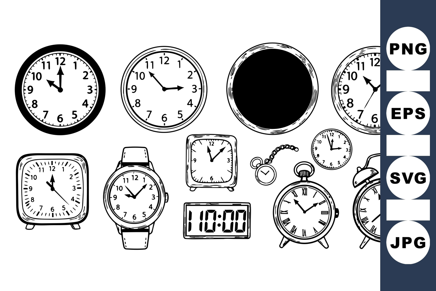 A detailed vector of various hand sketched timepieces including wall clocks, wristwatch, pocket watch, alarm clocks, and a digital timer in monochrome style