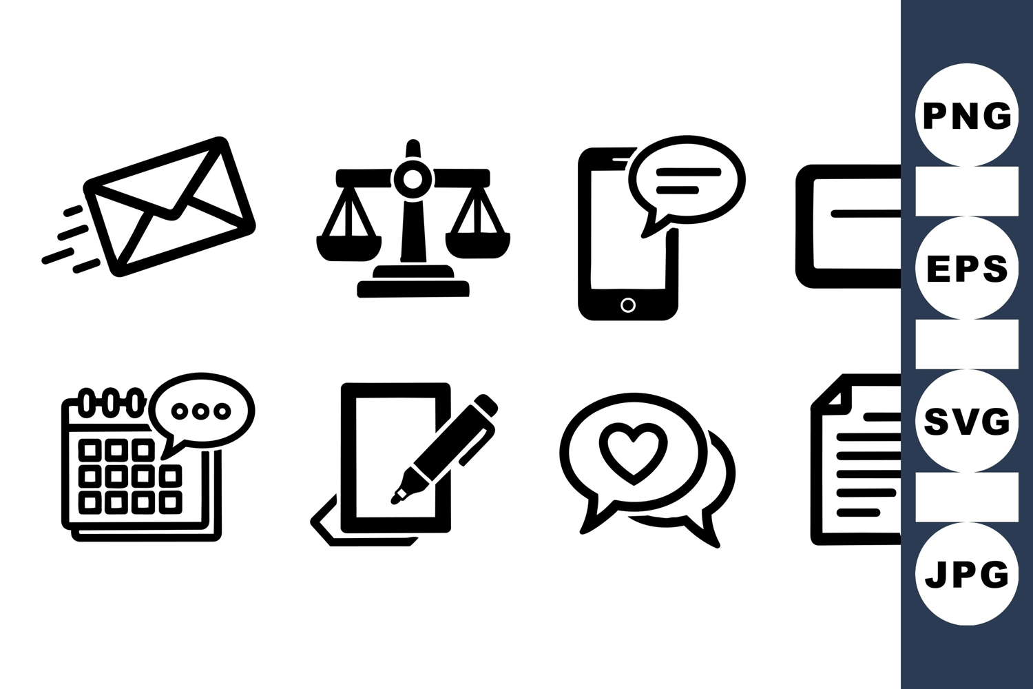Flat design vector icons representing communication, legal balance, mobile messaging, calendar planning, note writing, and document management in simple black style.