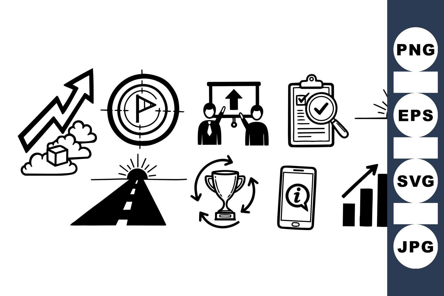 Black and white hand drawn vector icons showing business growth, achievement, target, smartphone, checklist, and sunrise symbols in simple minimal style.