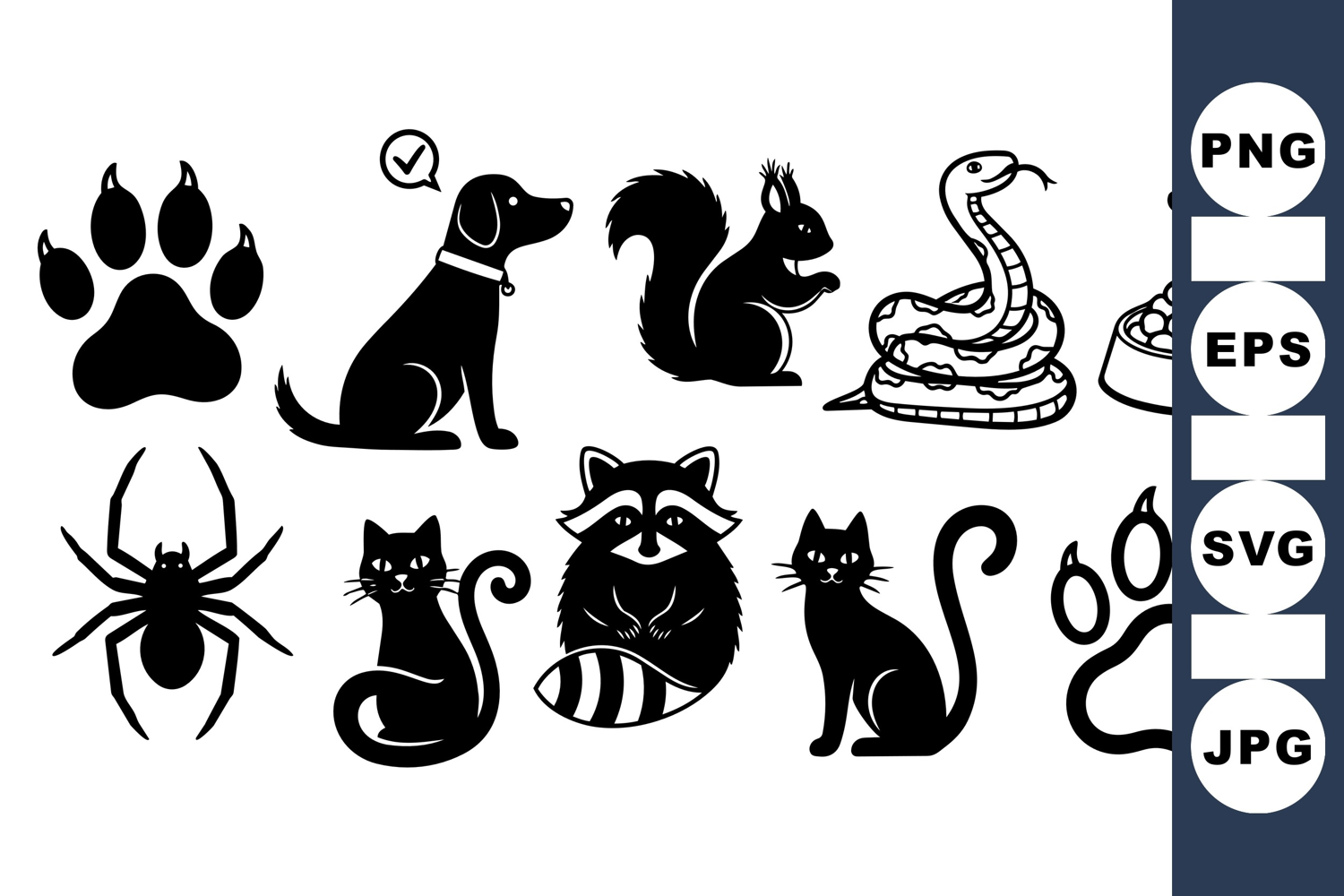 A collection of black animal silhouette icons including dog with check mark, squirrel, snake, food bowl, spider, cats, raccoon, and paw prints in simple vector art style, versatile for logos or apps, balanced and clear composition with peaceful mood.
