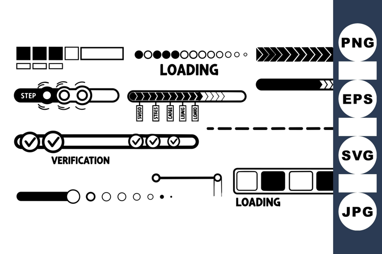 of minimalist black and white vector loading bars, progress steps, and verification icons designed for user interface displays with simple flat style.