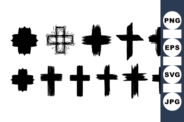 A collection of twelve unique black brush stroke crosses showcasing different abstract brush textures and artistic styles on a white background, minimalistic and bold.