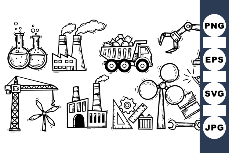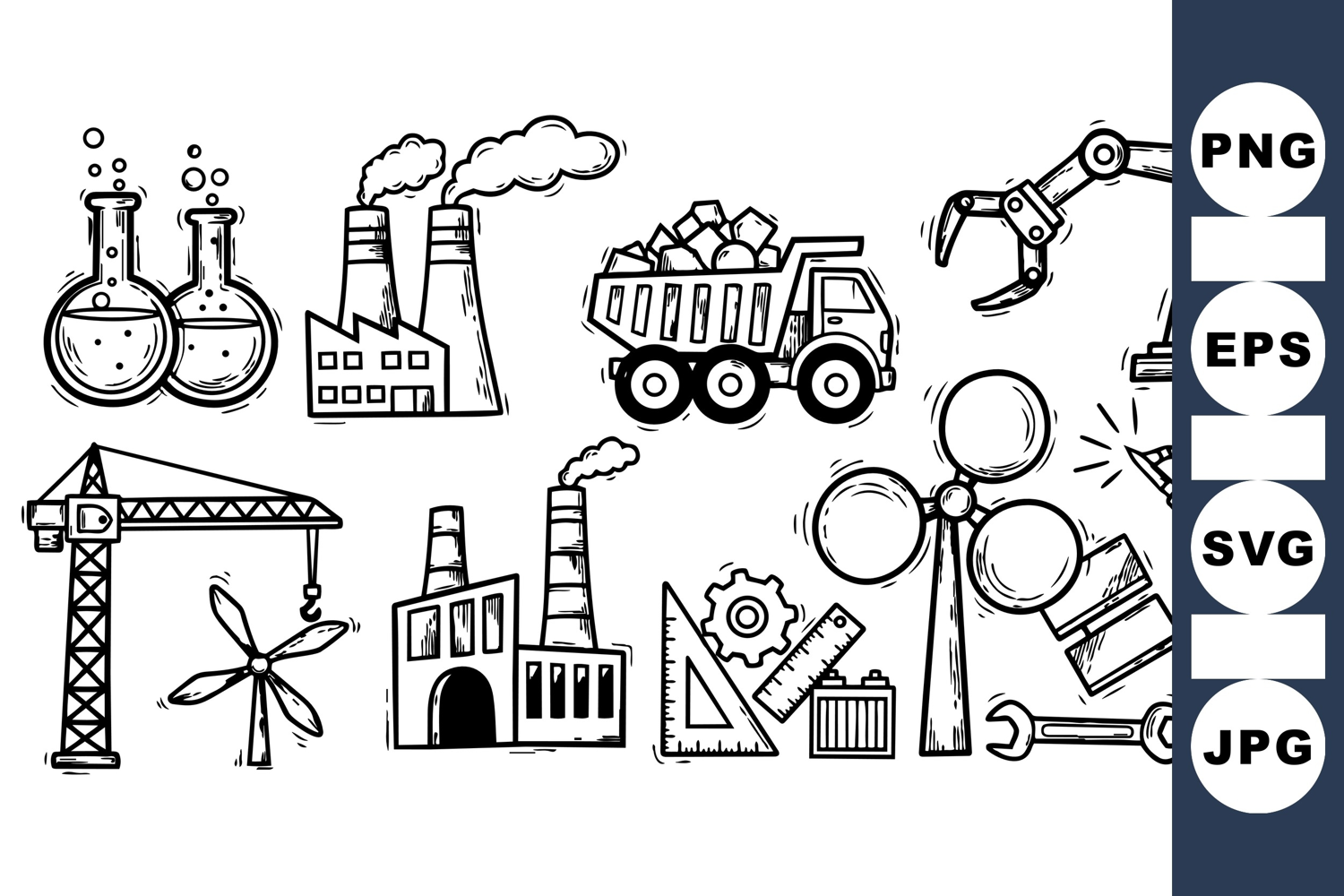 A hand drawn vector illustrating industrial elements such as factories, dump trucks, cranes, robotic arms, and engineering tools in black line art style.