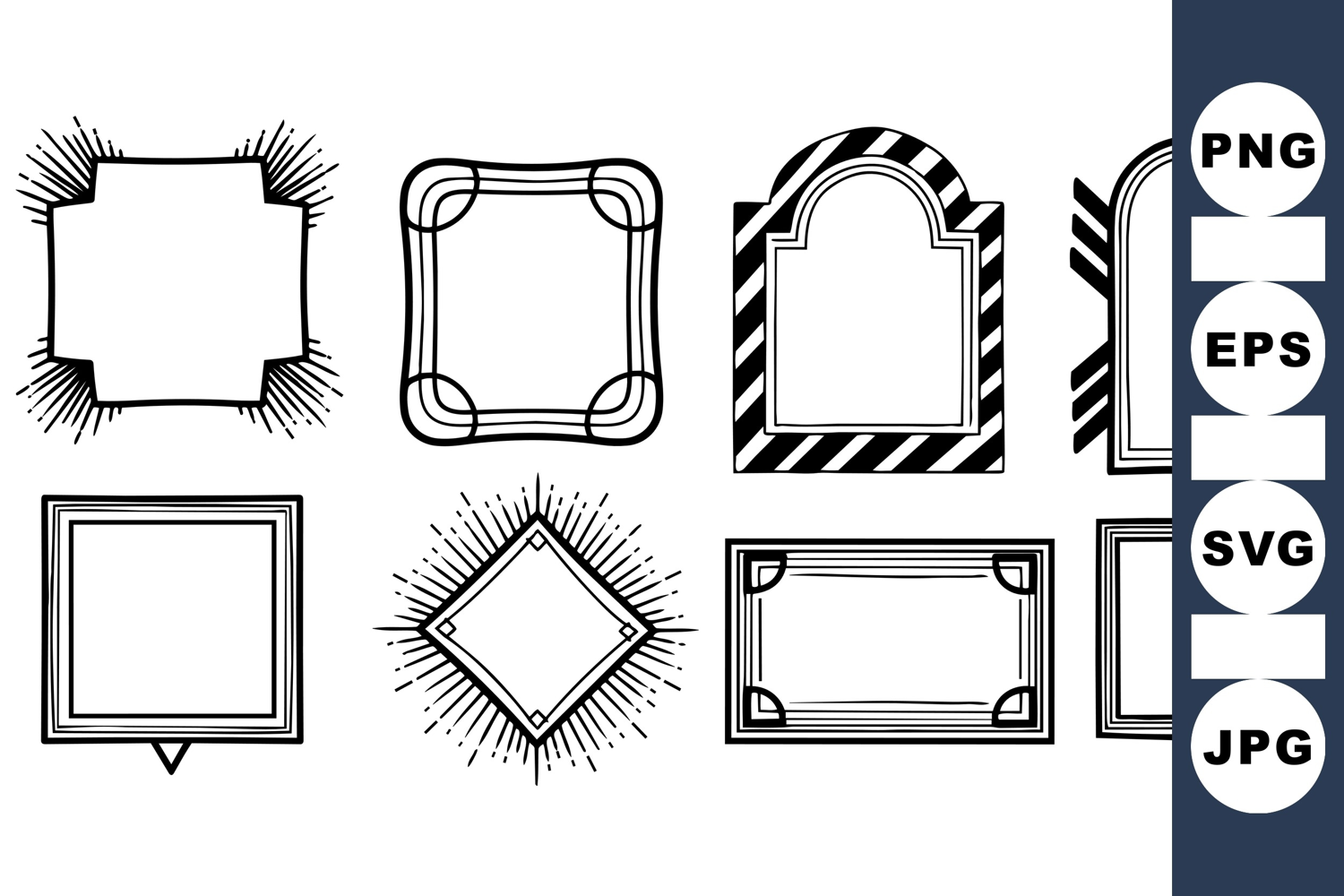 A collection of hand drawn black and white decorative frames with sunburst rays and striped patterns, featuring geometric shapes and vintage style, suitable for graphic design or branding projects.