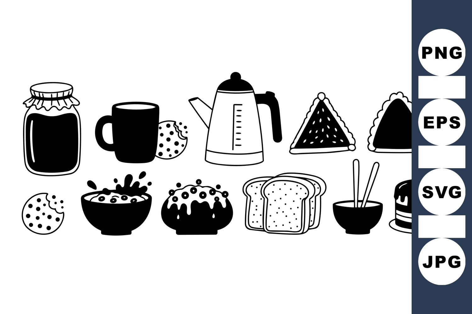 Minimalist black and white vector shows breakfast items like bitten cookie, coffee mug, bread slices, cake, jam jar and teapot in simple line art style.