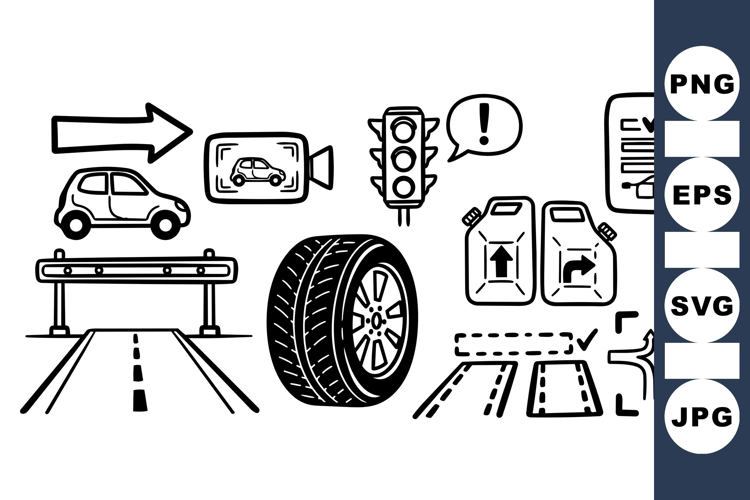 Hand Drawn Icon Wheel Vector Road Safety Symbols Transportation Icon Pack Car Traffic Vector Vehicle Clipart Pack Traffic Light Design Fuel Can Illustration Driving Route Arrows Road Sign Graphics