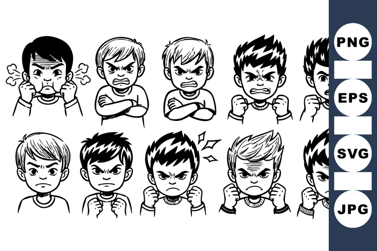 Black And White Svg Hand Drawn Faces Angry Boy Clipart Emotion Face Expression Vector Vector Illustration Pack Cartoon Boy Expressions Kids Cartoon Graphics Line Art Character Digital Emotion Kit