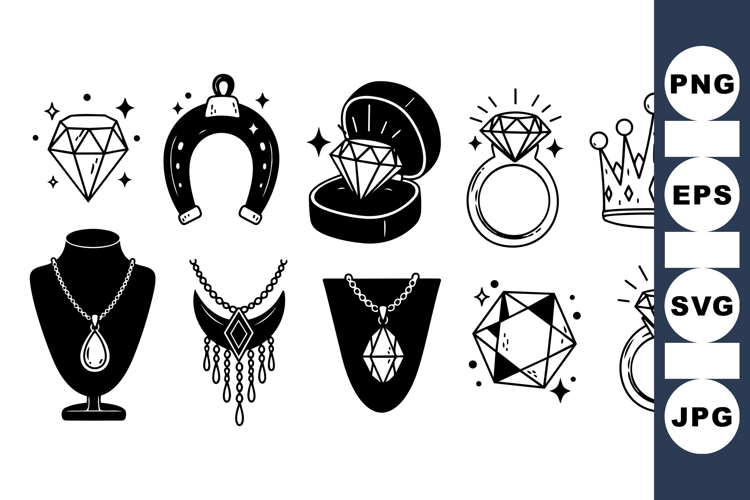 Stylish black and white vector collection showcasing sparkling diamonds, rings, crown, horseshoe, and intricate pendant necklaces in clean line art for jewelry design uses.