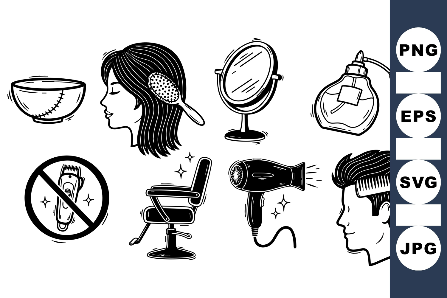 Black And White Art Barber Shop Hair Styling Tools Vintage Barber Barber Chair Svg Retro Haircut Clipart Men Hairstyle Design Female Hairbrush Clipart Classic Grooming Shaving Accessories Clipart