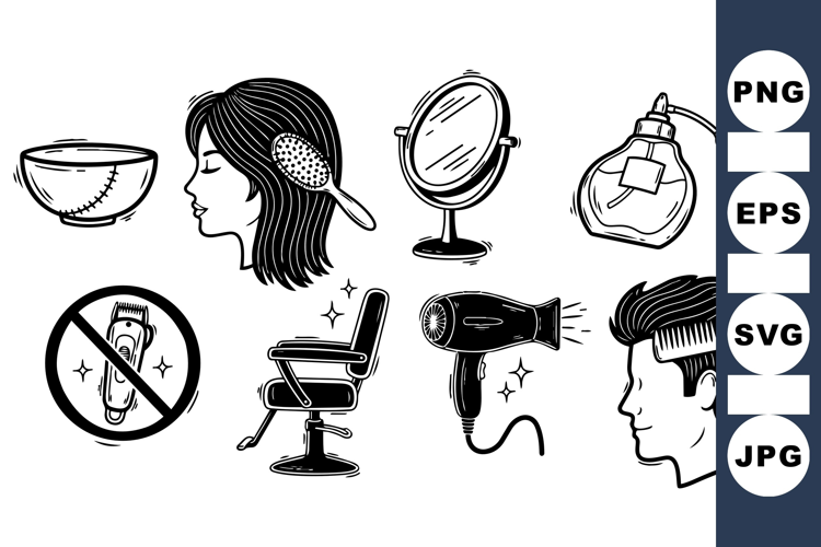 A black and white vector art collection of hair salon objects including hairbrush, mirror, perfume bottle, barber chair, and hairdryer with no clipper sign, presented in line art style with clean contrasts, suitable for branding and editorial design, classic and minimalist mood.