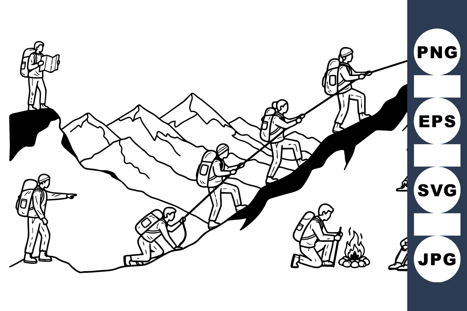 Simple black line vector art depicts hikers climbing steep mountain, camping by fire, reading map, and trekking, presenting outdoor adventure in minimalist style.