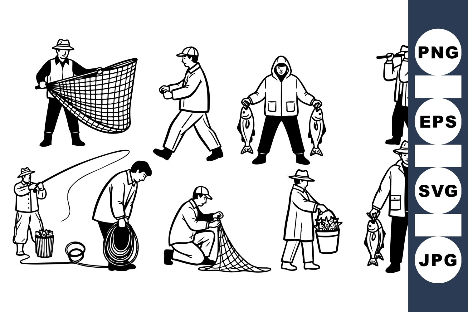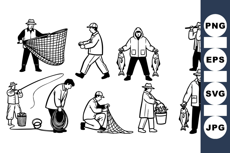 Various fishermen depicted in black and white vector art performing fishing activities like casting nets, holding fish and carrying baskets, showing traditional fishing methods.