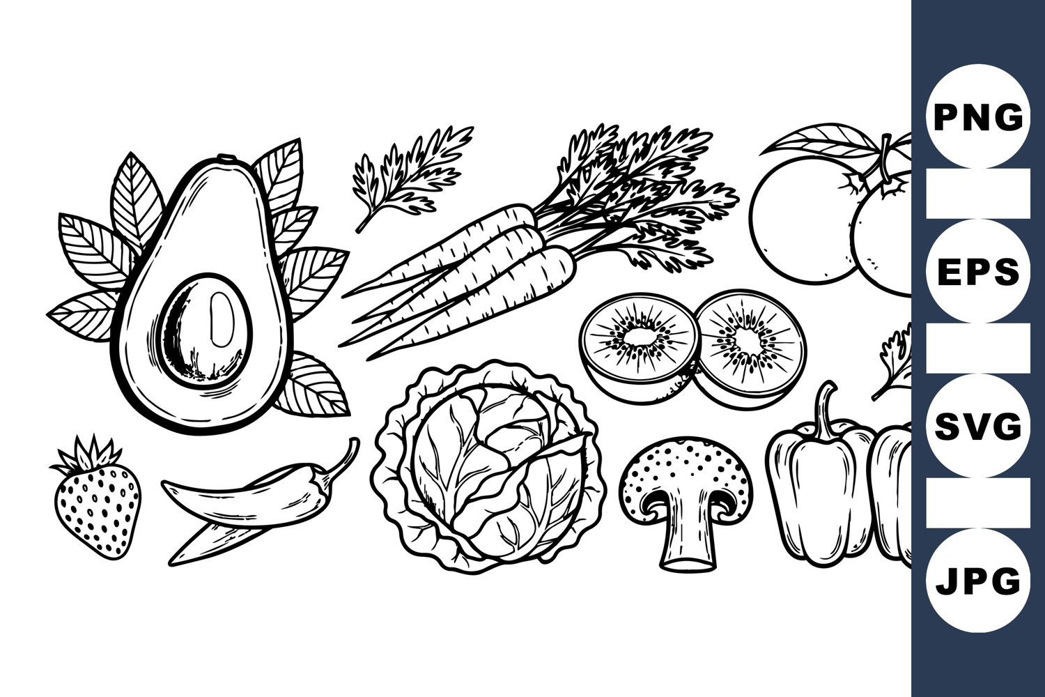 Detailed hand drawn black and white vector illustrations of fresh fruits and vegetables including avocado, carrots, kiwi, and peppers, perfect for food packaging or menus, artistic and natural.