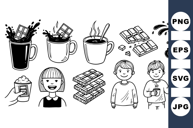 Black and white vector art displays children enjoying coffee with chocolate bars, splashes, and steam effects in a simple playful style, conveying warmth and joy.
