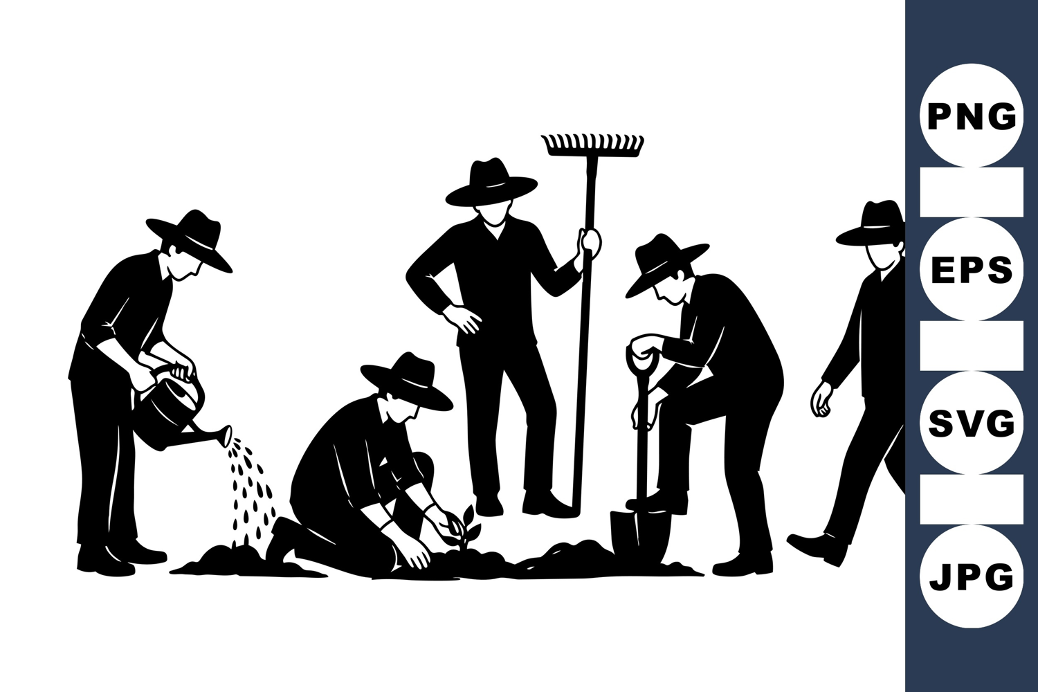 Classic black silhouette vector shows five farmers in wide brim hats performing soil digging, planting, watering, carrying bucket, and standing with rake in various farming actions.